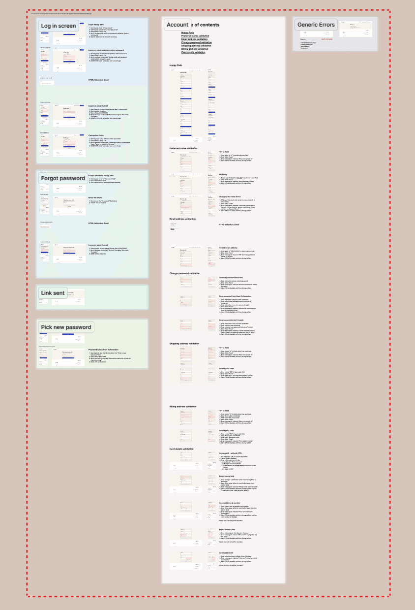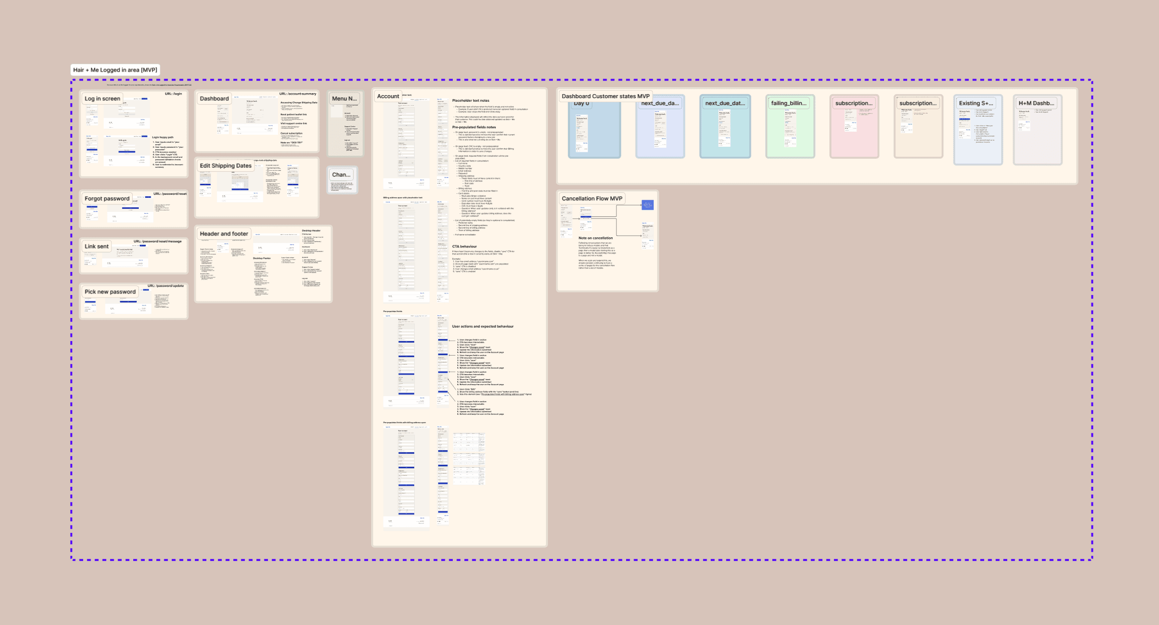 When a user is signed in, we provided customers information about their order state. We also gave them the ability to change their shipping date, their account information, and cancel their subscription. On the Account page, I made sure to include error states and a detailed breakdown of input fields, the placeholder text (if any), their field type, whether they were required or not, as well as any additional logic the developer should know at hand off.