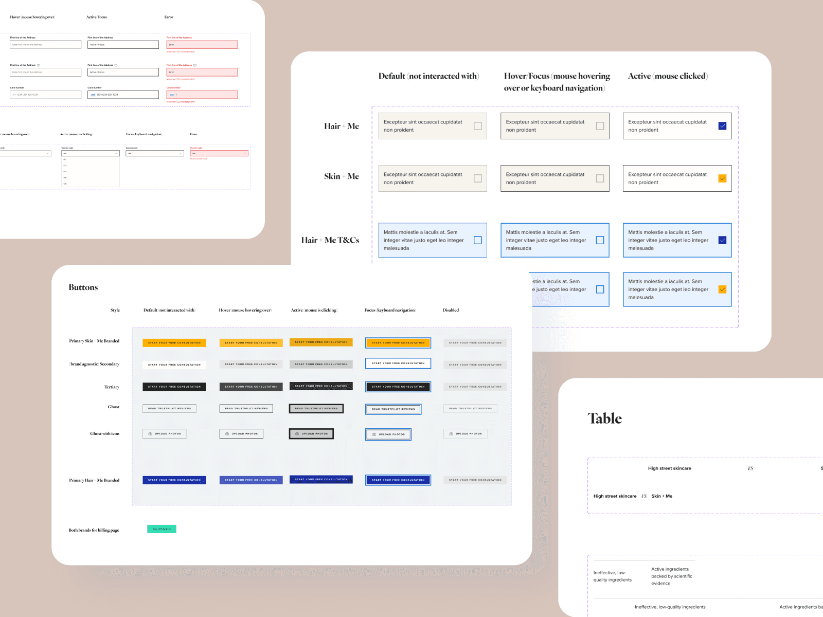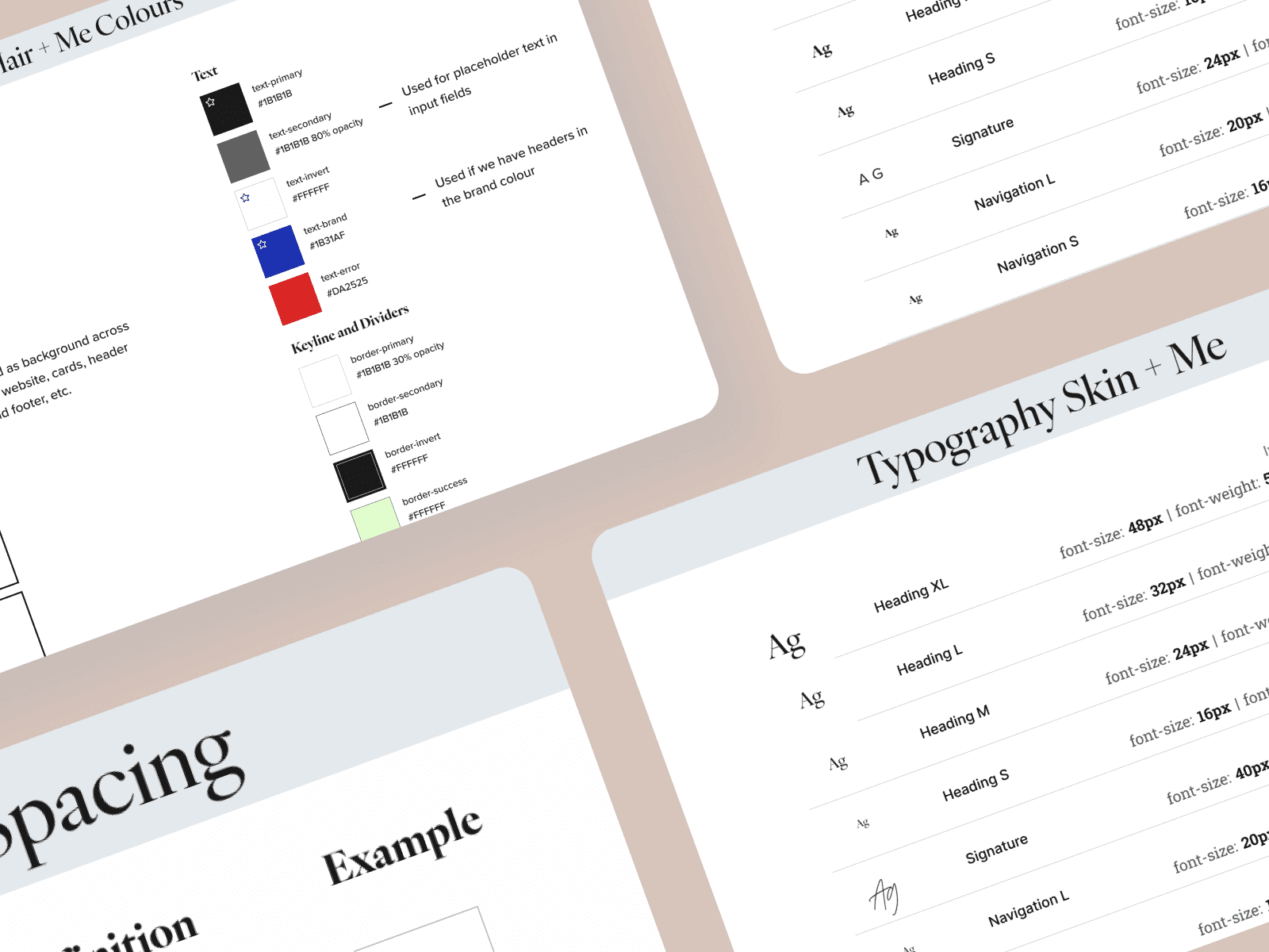 Prior to the development of Hair + Me, the Skin + Me brand was already undergoing an evolution of its brand into a more premium brand that also worked for the masses, a portmanteau of "Mass" and "Prestige". This raised the question of if Hair + Me would be using the same systems and platform as Skin + Me. While the Tech team were investigating the different approaches, I looked into developing a unified "Masstige Design System" in Figma that would have the same neutral colours but use the brand colours as the major differentiators.